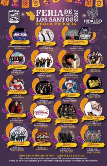 Feria de todos los Santos 2023 noviembre 5, 2023 Hidalgo, Michoacán Teatro del Pueblo Carlos Cuevas – Show en Vivo! Feria de todos los Santos 2023 5 de Noviembre – 8:30 PM Teatro del Pueblo Hidalgo, Michoacan. Entrada Libre.