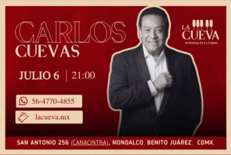 Show Intimo La Cueva julio 6, 2024 CDMX La Cueva El Rey del Bolero Carlos Cuevas – Show en Vivo! ¡Vamos a disfrutar una noche de bohemia! 6 de Julio – 21 horas – La Cueva CDMX. Boletos lacueva.mx 56 4770 4855 Alegría!
