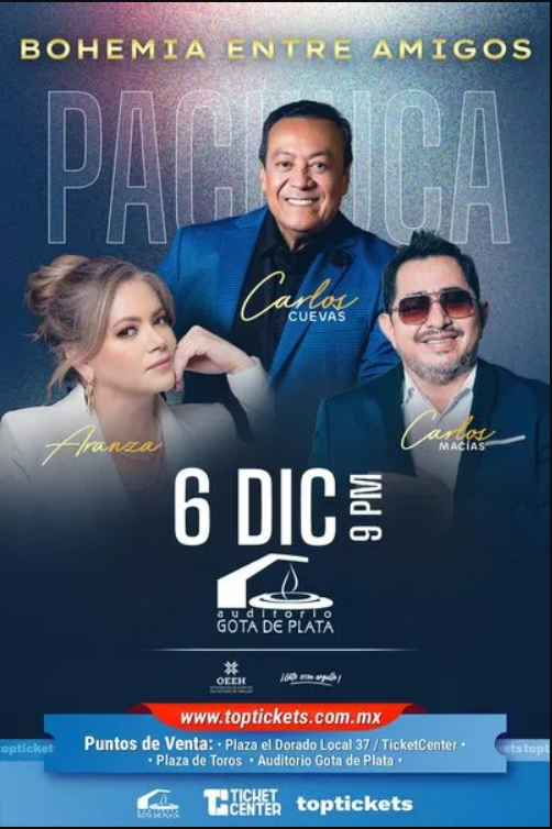 octubre 11, 2025 Concierto A Beneficio de la Basílica Liberiana Cosamaloapan, Ver octubre 18, 2025 La última y nos Vamos Veracruz Veracruz, Ver. octubre 24, 2025 Una Fiesta Romántica Tlalnepantla, Edo de Mex noviembre 8, 2025 La última y nos Vamos Puebla Puebla, Puebla noviembre 13, 2025 Y pensé cantarte un bolero CDMX noviembre 14, 2025 La Última y nos Vamos Guadalajara! Guadalajara, Jal noviembre 15, 2025 Encadenados SLP San Luis Potosí, SLP noviembre 21, 2025 Black & White Party 2025 Ciudad Juárez, Chihuahua noviembre 29, 2025 La Caravana del Amor MTY Monterrey, Nuevo León diciembre 5, 2025 Sinfónica Bohemia Cuernavaca, Morelos diciembre 6, 2025 Bohemia entre Amigos Pachuca, Hidalgo diciembre 31, 2025 Un Concierto para Recordar Aguascalientes, Ags